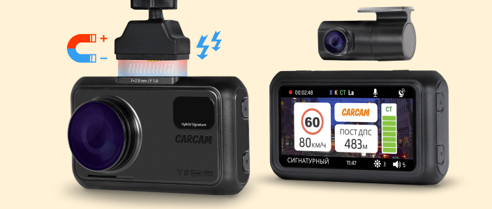 Новая флагманская линейка состоит из 2 моделей. CARCAM HYBRID 2 Signature — базовая модель Quad HD видеорегистратора. Устройство оснащено матрицей SONY и записывает видео в разрешении 2560×1440p. Благодаря сигнатурному радар-детектору, а также SpeedCam информеру прибор всегда предупредит вас о приближении к камерам контроля ПДД и радарным-комплексам.