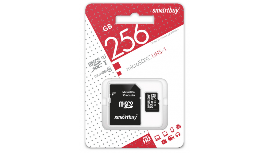 256GB microSDXC Class10 SMARTBUY – карта памяти типа microSDXC объемом 256 ГБ. Скорость записи данных может достигать 10 МБ/с (скорость чтения - 80 МБ/с). Благодаря 10 классу скорости карта памяти быстро и корректно работает при высоких нагрузках со всеми устройствами. Накопитель отлично подойдет как для смартфонов, так и для автомобильных видеорегистраторов. Дополнительно в комплект входит SD-адаптер.