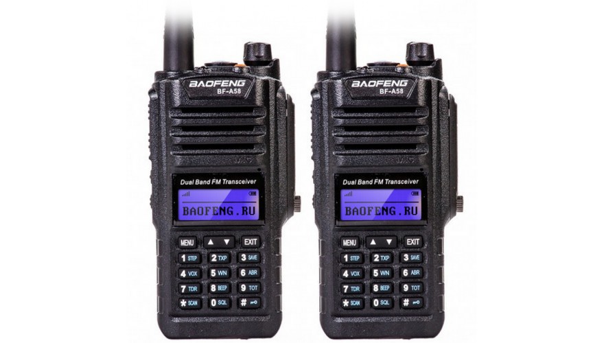 BAOFENG BF-A58 – комплект из двух универсальных раций, который отлично подойдет как для рыбалки, охоты и походов, так и для связи на строительных площадках и многих других объектах. Устройства работают в двух частотный диапазонах 136-174MHz и 400-520MHz. Благодаря встроенному радиопередатчику мощностью 5W, рации способны передавать сигнал на расстояние до 12 километров в зависимости от рельефа местности.