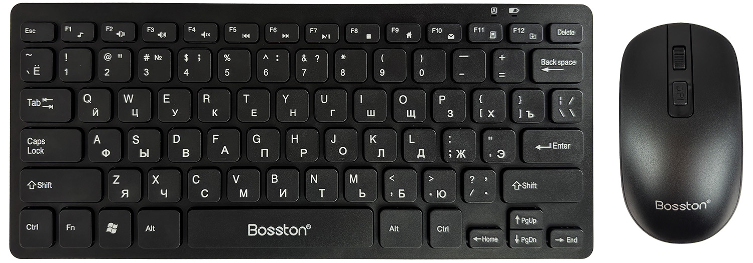 Bosston Wireless Mini Keyboard and Mouse Combo (WS600) Black - это набор, состоящий из беспроводной клавиатуры и мыши, который обеспечивает удобную работу за компьютером. Миниатюрная клавиатура с русской раскладкой состоит из 78 клавиш. Расположение клавиш компактное, удобное и эргономичное. Клавиши обладают микродуговой поверхностью, удобной для нажатия. Беспроводная оптическая мышь идеально дополняет клавиатуру. Разрешение мыши регулируется в диапазонах 1000/1200 dpi, позволяя подстроить чувствительность под личные предпочтения. Облегченный вес мыши не создает излишнюю нагрузку на руку и запястье при длительной работе. Удобный изгиб и симметричная конструкция с центральным колесом подходит как для правой, так и для левой руки. Радиус действия беспроводной связи 10 м гарантирует свободу движения без ограничений. Мини USB-приёмник обеспечивает быструю установку без драйверов и стабильное подключение.