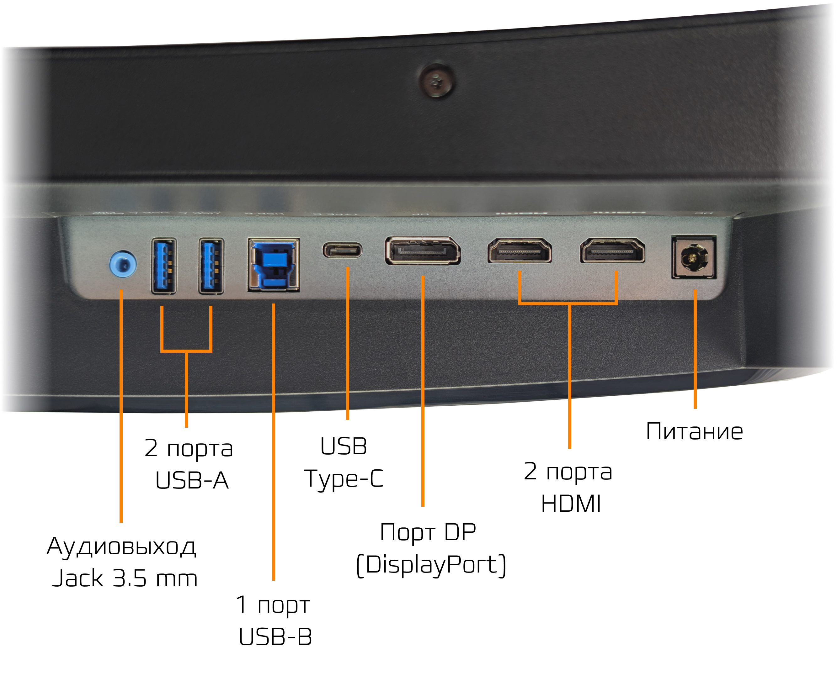 Монитор оснащен полным набором современных интерфейсов для подключения различных устройств. В арсенале модели имеются порты HDMI и DisplayPort для подключения компьютеров и игровых консолей, а также порт USB Type-C с мощностью до 65 Вт, который позволяет не только передавать видеосигнал и данные, но и заряжать подключенные устройства, такие как ноутбуки или планшеты. Встроенный USB-хаб расширяет возможности подключения периферийных устройств, а аудиовыход позволяет подключить внешние наушники или акустическую систему.