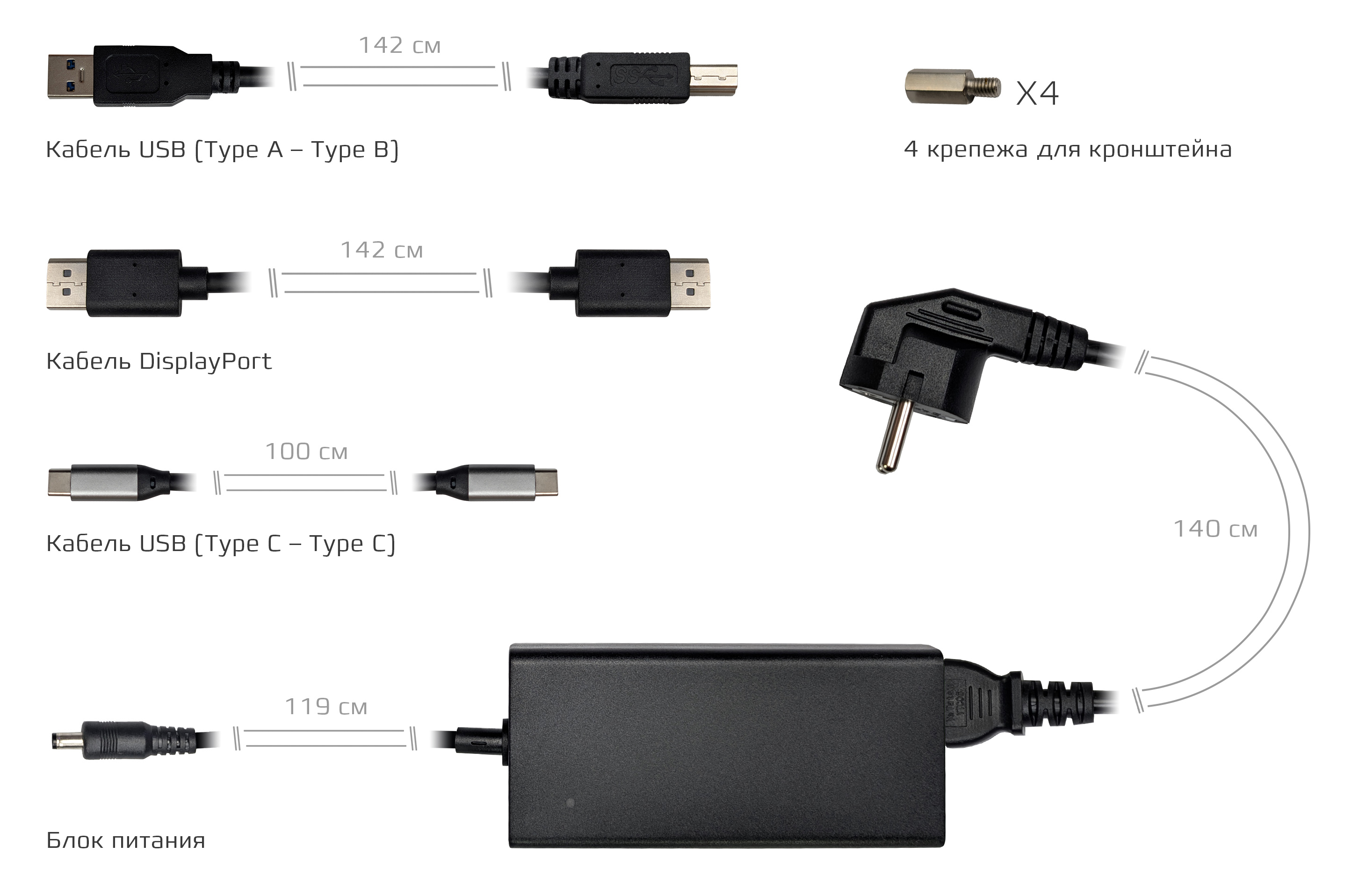Монитор, Подставка, База, Болты, Кабель Type-C, Кабель DP, Адаптер питания, Кабель USB-A, Винты для крепления на стену, Инструкция |