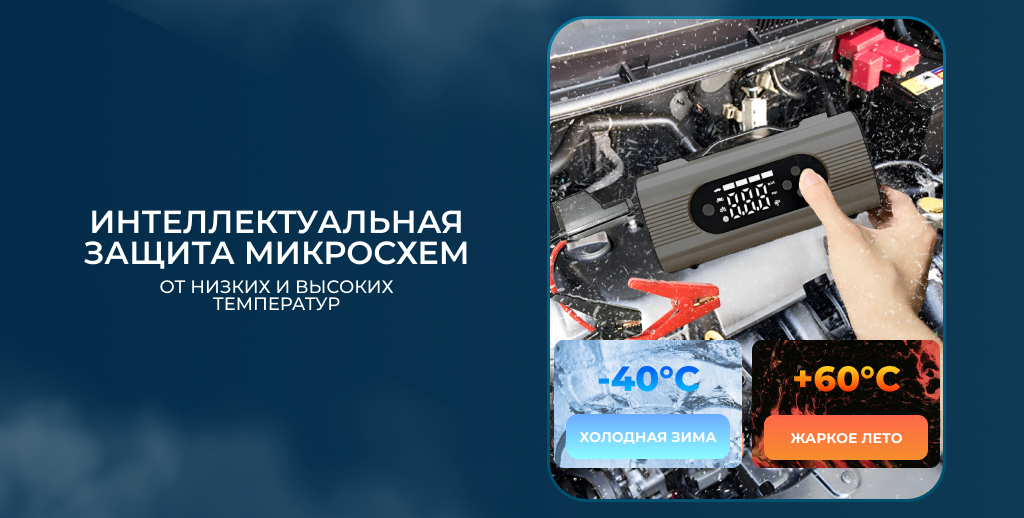 Устройство работает при температуре от -30°C до +60°C. Температура хранения пуско-зарядного устройства от 0°C до +30°C. Зарядите его в декабре и оставьте в бардачке на всю зиму – через 6 месяцев останется больше 90% заряда. Зажимы изготовлены из чистой меди, устойчивой к низким температурам.