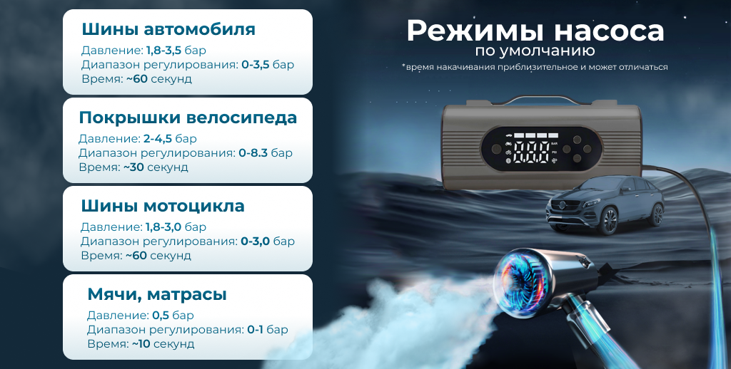Пусковое устройство, Компрессор, Пылесос, Воздуходувка, Датчик давления в шинах, Внешний аккумулятор, Фонарик, Вакууматор |