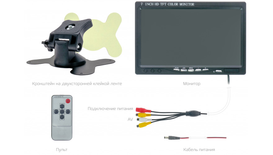 Кронштейн на двухсторонней клейкой ленте позволит закрепить монитор на торпедо любого автомобиля. Кроме того, крепление позволяет поворачивать монитор на 360° и регулировать угол наклона.