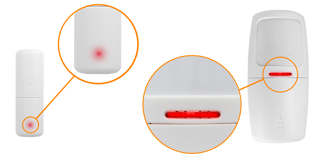 В комплект входят 2 беспроводных датчика: инфракрасный датчик движения и магнитоконтактный датчик открытия двери или окна. Датчики подключаются к главной панели управления на частоте 433 МГц.