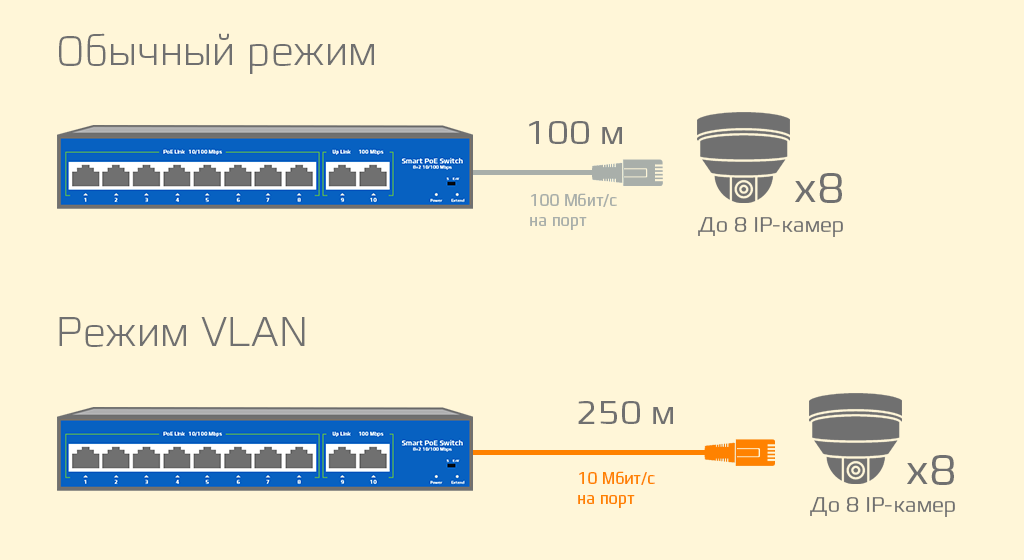 Устройство может работать в 2 режимах. В стандартном режиме устройство работает как PoE-коммутатор и передаёт сигнал на расстояние до 100 метров. Режим VLAN позволяет создать несколько виртуальных сетей в рамках одной локальной сети, используя всего один коммутатор. При этом максимальная дальность передачи сигнала может достигать 250 метров.