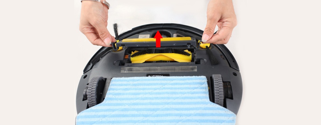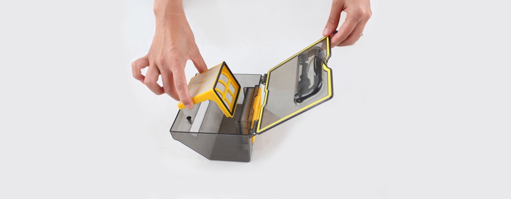 Центральная щетка для очистки вынимается очень легко нажатием на два язычка по бокам рамки. Пылесборник расположен под крышкой с сенсорной панелью. Доступ к контейнеру открывается нажатием на кнопку. На контейнере закреплена щетка для чистки от пыли и волос.