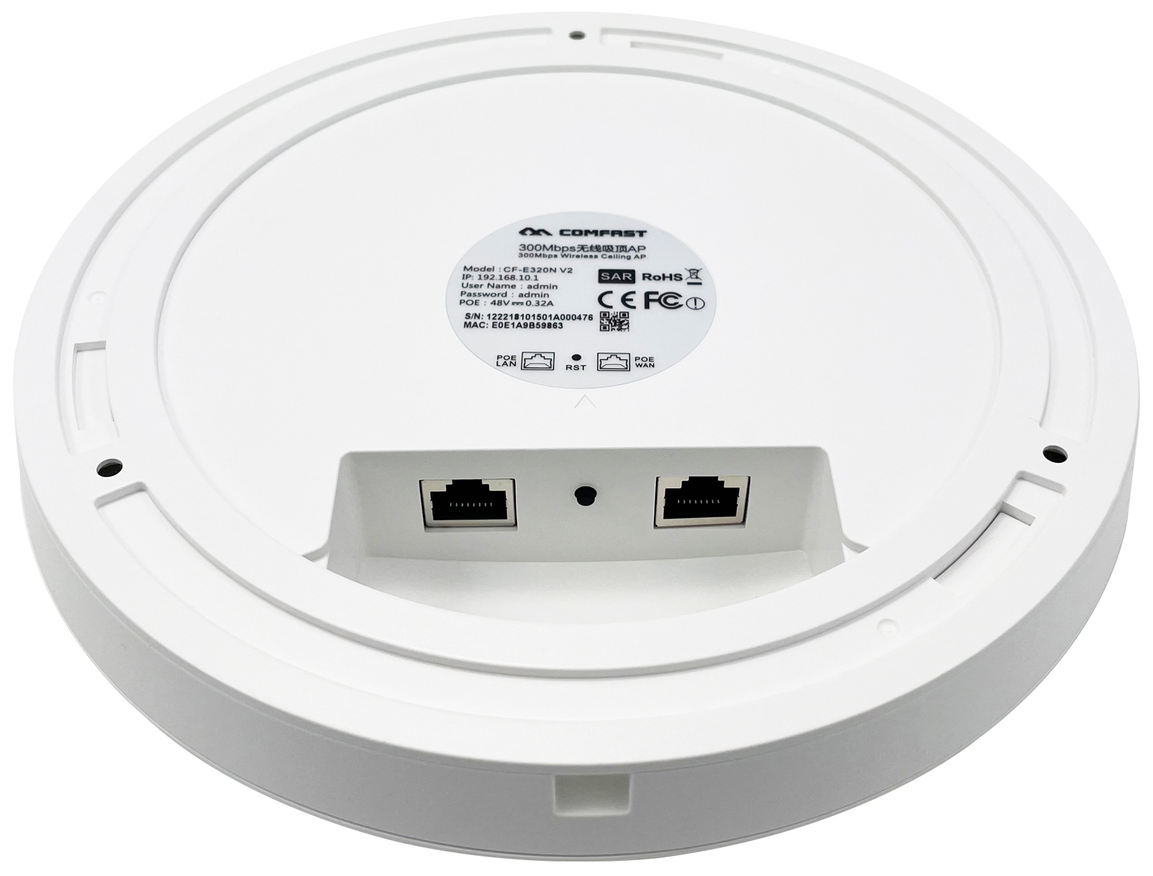 COMFAST Wireless Ceiling AP 300Mbps (CF-E320N V2) – точка доступа, предназначенная для создания WiFi-сетей. Максимальная скорость передачи данных составляет 300 Мбит/с. Устройство имеет возможность крепления на потолок или стену, поддерживает проводное интернет соединение по порту WAN с последующей передачей интернета IP-устройствам по Wi-Fi и по порту LAN. Питание осуществляется по технологии РоЕ как по WAN, так и по LAN порту от PoE-устройств (РоЕ-инжектор, РоЕ-коммутатор). Подходит для установки альтернативной прошивки OpenWrt на базе MediaTek. Установка альтернативной прошивки выполняется пользователем самостоятельно и даёт полный контроль над роутером.