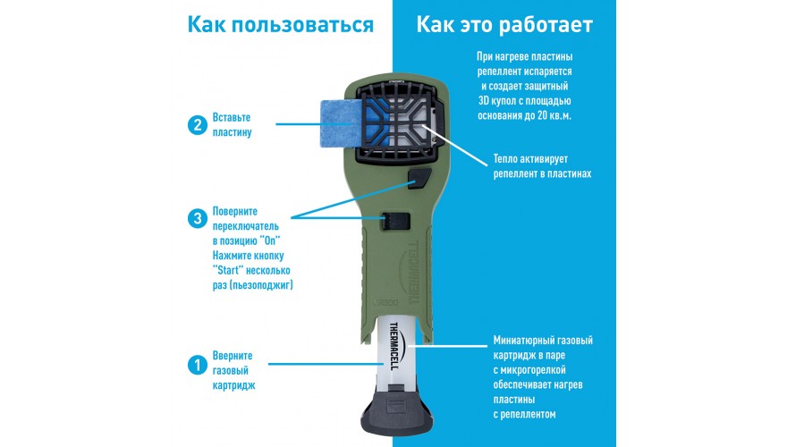 Фумигатор + пластины Thermacell MR-300 Repeller, Оливковый – это усовершенствованный прибор из серии переносных фумигаторов, предназначенных для защиты от комаров и мошек во время активного отдыха. Работает по принципу фумигации, испаряя в воздух репеллент, который отпугивает насекомых на площади до 20 кв. м. Прибор не зависит от электричества. Пластина нагревается за счет газового бутанового картриджа. А сама пластина является запатентованной разработкой американских ученых-технологов. Она не выделяет запах и не дымит, делая Thermacell безвредным для детей и аллергиков. В комплект фумигатора входят 3 пластины и картридж, которые обеспечивают 12 часов бесперебойной работы.