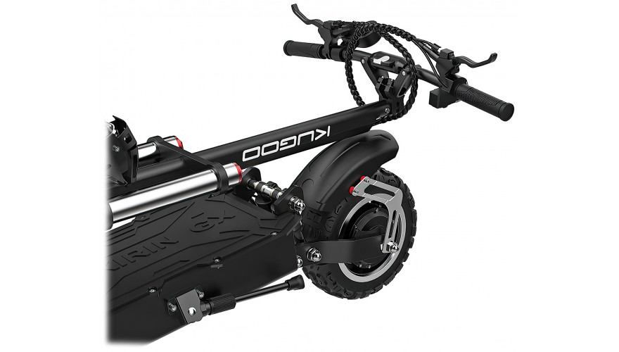 KUGOO Kirin GX Pro – мощный полноприводный электросамокат, созданный в первую очередь для внедорожной езды. Двухкоронная мотоциклетная вилка спереди обеспечивает максимальную плавность хода во время езды по любым неровным покрытиям, включая гравий или песок. Задний маятник обладает разными степенями жесткости эластомеров, что позволяет в комплексе настроить подвеску самоката под конкретную поездку и вес пользователя. Новая тормозная система кардинально отличается от любого аналогичного электросамоката. На Kugoo Kirin GX Pro установлены гидравлические тормоза с рекуперацией и дополнительным электротормозом на каждом моторе. Встроенный аккумулятор обладает ёмкостью 38400 мАч и обеспечивает до 100 километров пути на одном заряде. Два электромотора мощностью по 2500 Вт каждый, обеспечивают максимально быстрый разгон до 80 километров в час. На пиковой мощности самокат способен ехать в гору с наклоном до 40 градусов. Это один из самых сильных показателей на сегодняшний день. На рулевой стойке установлены 2 LED-фары, которые освещают до 50 метров пути перед самокатом. Кроме того, устройство оснащено дополнительной LED-подсветкой с боков деки и задним габаритным фонарём. Высокопрочная алюминиевая рама способна выдержать нагрузки до 160 килограмм при собственном весе в 44 килограмм. Благодаря складной конструкции самокат удобно перевозить в багажнике автомобиля.