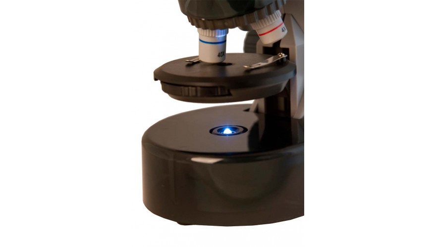 Этот микроскоп позволяет рассматривать прозрачные объекты – каплю воды из аквариума, тончайший срез растения или специально подготовленные микропрепараты. Образец для изучения помещается на удобный круглый предметный столик. Благодаря двум надежным зажимам препарат не собьется, даже если юный исследователь случайно толкнет микроскоп. Свет от светодиодов, расположенных под предметным столиком, проходит сквозь образец, и увеличенное изображение появляется в окуляре. Яркость подсветки легко регулировать.