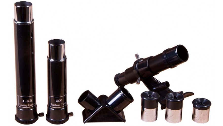 Оптика рефрактора сделана из полностью просветленного стекла – это улучшает четкость и контрастность картинки. В комплект поставки включено несколько окуляров. Меняя их, можно выбирать подходящее увеличение для наблюдений – большее или меньшее. Диагональное зеркало, тоже входящее в комплект поставки, используется для наземных наблюдений. Как и все телескопы Levenhuk Skyline BASE 50T переворачивает картинку вверх ногами, а диагональное зеркало возвращает ее к привычному виду.