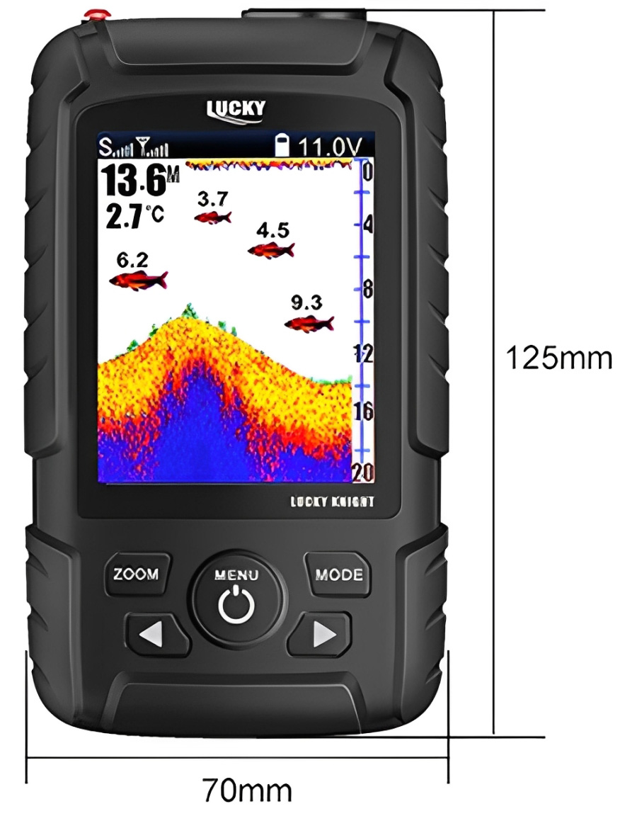 LUCKY Portative Echo Sounder FF718LICD-WT - это эхолот с двумя датчиками (беспроводной и проводной) для рыбалки с берега и с лодки, способный определять местонахождение рыбы, показывать ее размер, рассчитывать глубину до дна и до рыбы, измерять температуру воды и отображать структуру рельефа дна водоема. Дальность приема и передачи сигнала от беспроводного датчика до блока составляет 150 метров (зависит от условий использования). Луч обладает широким углом сканирования - 90° и частотой 125 кГц. Глубина сканирования составляет до 45 метров. Кабельный зонд: диапазон глубины: 0,7–100 м; угол луча при частоте сонара: 20 градусов при 200 кГц / 60 градусов при частоте 83 кГц. Конструкция прибора готова к применению сразу, не требуется подключать к ней смартфоны или иные гаджеты, проводить синхронизацию с ними или устанавливать репитеры для улучшения сигнала.