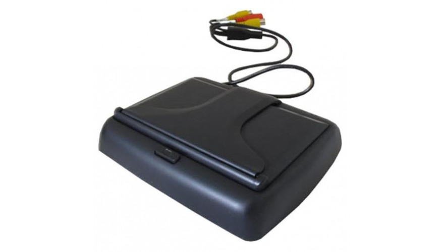 Монитор открывается нажатием кнопки, закрывается сложением. Формат изображения 4,3”-дюйма, большое разрешение экрана 960х468 пикселей. Монитор адаптирован под форматы видео PAL/NTFS.