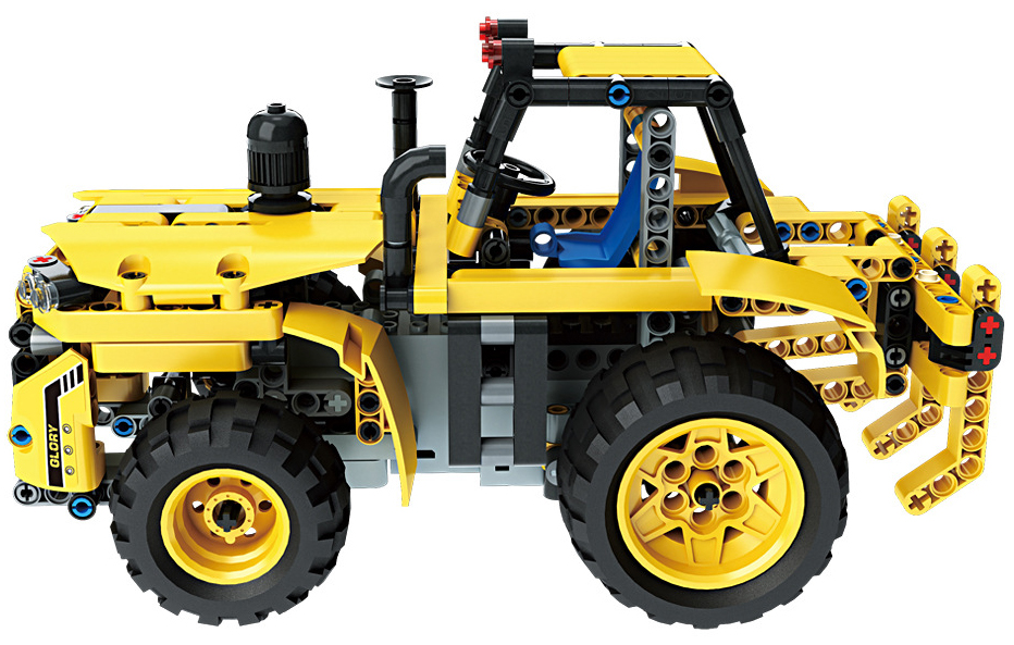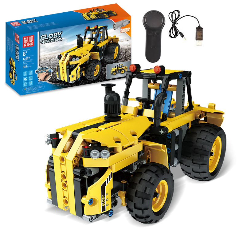 Mould King Glory Guardians 13017 – игровой конструктор, который позволяет создать копию трактора на радиоуправлении. В нём проработаны водительское кресло, массивные заднее крепление для навесного оборудования и 4 прорезиненных колеса разных размеров. Стоит нажать на соответствующую кнопку пульта, как колёса техники придут в движение. Полная совместимость элементов с конструкторами LEGO открывает дополнительный простор для фантазии. Общее количество элементов конструктора – 382 штуки. Подходит для детей от 8 лет. Продукт полностью изготовлен из безопасного ABS пластика. Чтобы процесс сборки не вызывал излишних трудностей была разработана удобная и понятная инструкция с точным описанием последовательности действий.