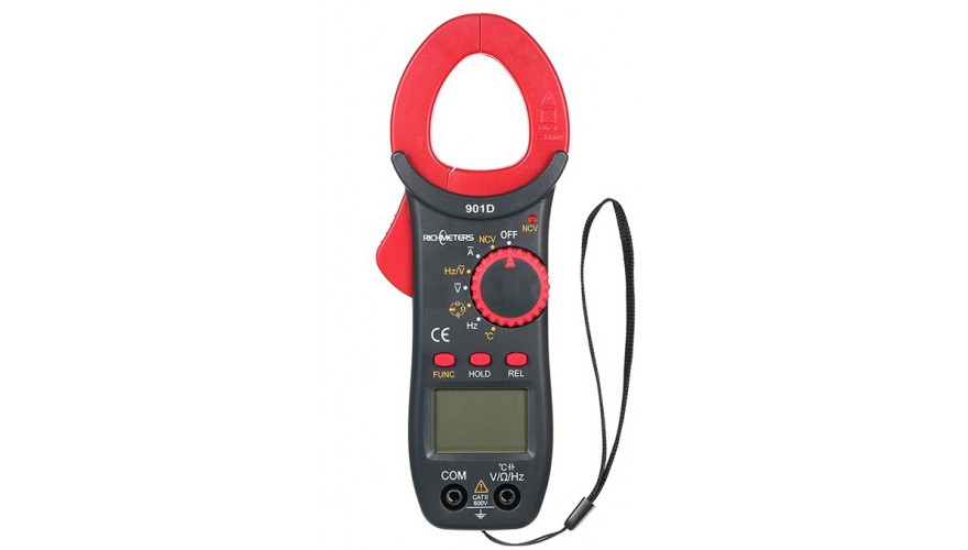 RichMeters RM901D – цифровые токовые клещи, которые имеют автоматический выбор пределов измерения и режим автоотключения. Применяются для измерений переменного тока, постоянного и переменного напряжения, сопротивления, емкости и температуры. Имеется функция бесконтактного определения напряжения (NCV), функция True-RMS. Количество единиц счета - 3999. ЖК-дисплей. Индикатор низкого заряда батареи. Расстояние зажима: 25 мм. Питание осуществляется от двух батареек ААА.