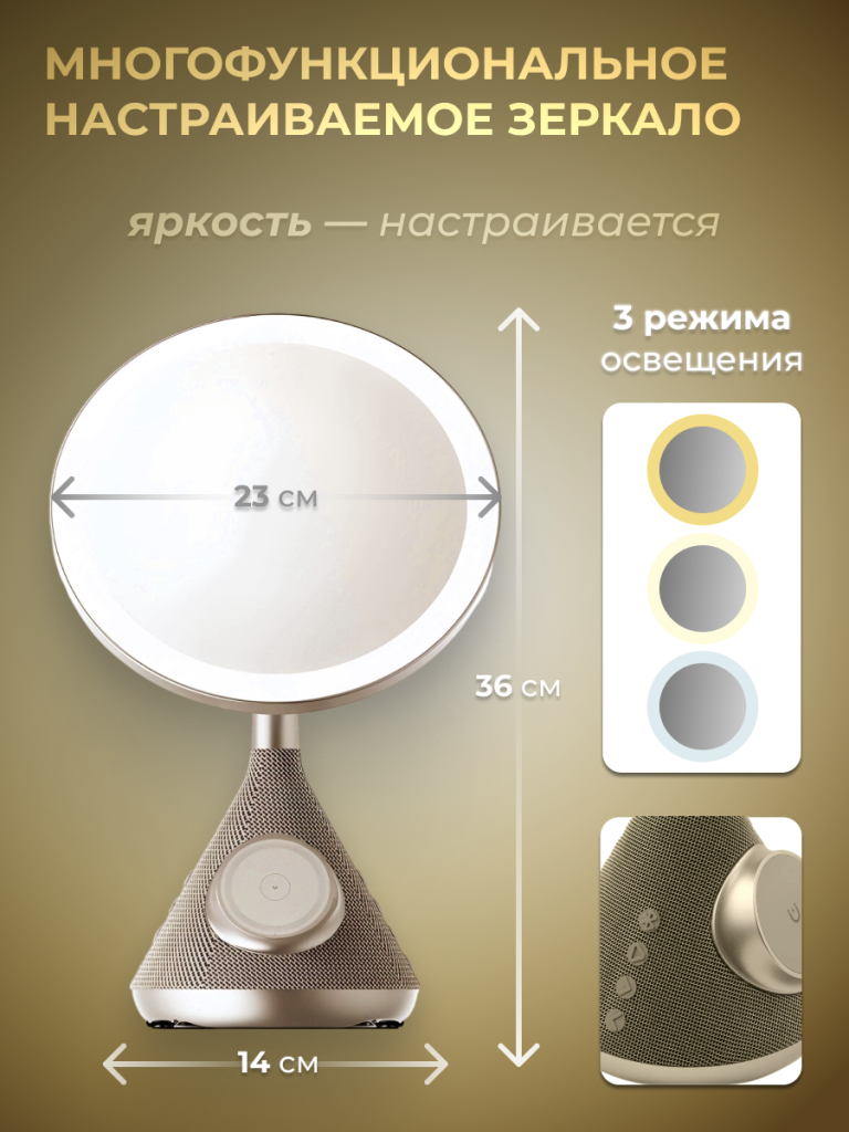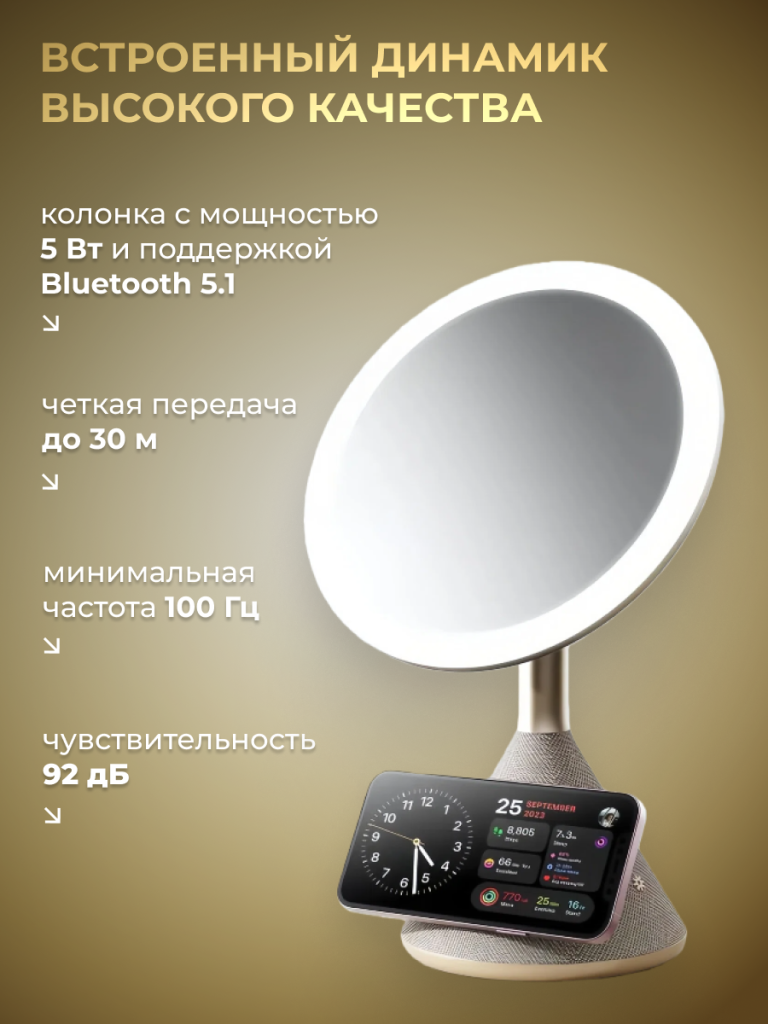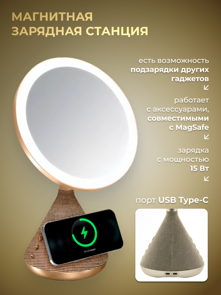 SenCiciMen Multi Functional Mirror with Speaker and Magsafe Charger (SCMW02243) Gold - это универсальное зеркало 3-в-1 с LED-подсветкой. Изделие совмещает в себе косметическое зеркало, высококачественный динамик и беспроводное зарядное устройство. Подключается ко всем устройствам с поддержкой Bluetooth для бесшовной потоковой передачи звука, обеспечивая четкую передачу до 30 м. Динамик автоматически подключится к ранее подключенному устройству для удобства, в то время как выходная мощность 5 Вт обеспечивает четкий, чистый звук. Технология MagSafe от Apple прикрепляет ваш смартфон к платформе с помощью магнита без необходимости использования проводов. Это обеспечивает бесшовное и безопасное соединение. Работает с аксессуарами, совместимыми с MagSafe. Данная функция позволяет размещать телефон на беспроводной зарядной подставке, благодаря чему во время зарядки вы можете смотреть видео и не только. На зеркале имеется 3 универсальных настройки освещения: теплый, естественный и холодный белый. Также вы можете отрегулировать яркость в зависимости от ваших потребностей.