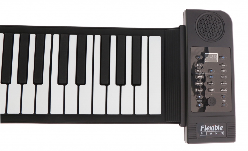 SILICON FLEXIBLE ROLL UP PIANO 61 – портативное пианино с 61 клавишей. Выполнено из гибкого силикона, благодаря чему быстро сворачивается в рулон. Помимо встроенного динамика устройство поддерживает подключение наушников, колонок. Доступно 128 тонов, 128 ритмических паттернов, 14 демо мелодий. Есть функции записи, проигрывания, редактирования, регулировка громкости, сустейн, вибрато, аккорды, обучающий режим. Устройство может быть подключено к компьютеру через Midi-выход или Micro-USB, а также к iPad, iPhone и Android устройствам. Питание возможно от кабеля питания USB-DC 5 В или от встроенного аккумулятора.