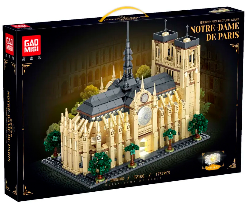 TaiGaoLe Gao Misi Notre Dame de Paris (T2106) – конструктор, копирующий Нотр-Дам-де-Пари. Общее количество деталей конструктора – 1757 штук. Сборка детализированной модели собора Парижской Богоматери увлечёт не только ребенка, но и взрослого. Детали выполнены из высококачественного пластика, который абсолютно безопасен и не выделяет вредных веществ. Особенностью набора является светильник, который можно разместить внутри. Подходит для детей от 6 лет.