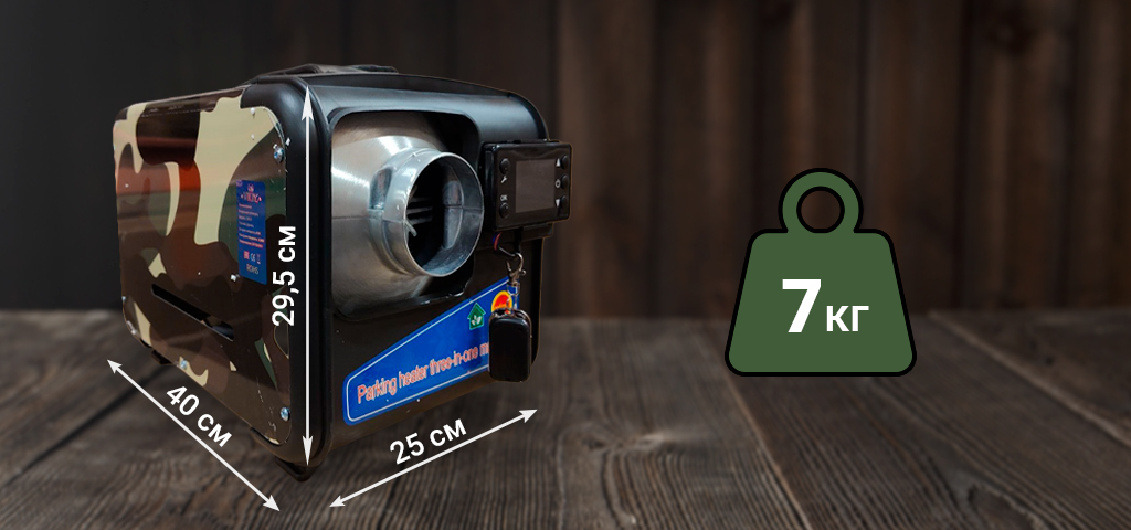 Управление отопителем осуществляется через интуитивно понятную панель с кнопками и ЖК-дисплеем либо с помощью дистанционного пульта, работающего на расстоянии до 50 метров. Это даёт вам свободу выбора способа взаимодействия с устройством, делая использование максимально комфортным.