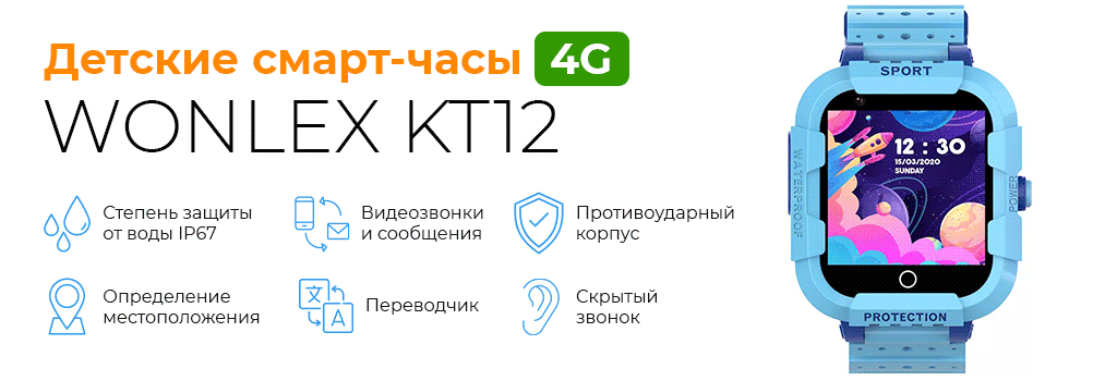 WONLEX KT12 BLUE – умные часы созданные специально для детей, которые сочетают функционал умных часов, телефона и средства безопасности ребенка. Часы оборудованы продвинутым модулем GPS-трекинга с функцией SOS, благодаря которым родители всегда могут быть уверены, что их ребенок в безопасности. Детей порадует яркий сенсорный экран, фотокамера, функция голосового и текстового чата. Отличительной чертой этой модели является корпус имеющий защиту от влаги и пыли и защитная противоударная конструкция, а силиконовый ремешок с классической застежкой подойдет на любую руку (обхват запястья от 13 до 19 см). Управление часами осуществляется со смартфона родителя через бесплатное приложение SeTracker, с его помощью можно установить геозоны, отслеживать местонахождение и перемещение ребёнка.
