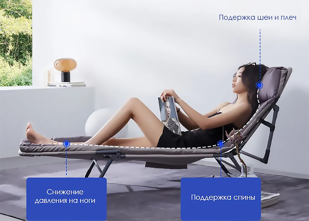 Xiaomi 8H Outdoor Dual-Purpose Folding Bed RC Gray – удобная складная кровать-шезлонг для гостей и путешествий. В сложенном виде она меньше метра в длину, а весит чуть больше 6 кг. Удобная ручка позволяет легко переносить кровать с места на место. Основание кровати выполнено из металлических трубок диаметром 2,2 см, а матрас выполнен из плотной водонепроницаемой ткани. Изголовье кровати удобно поднимается под углом до 90 градусов, сбоку у нее есть кармашек для аксессуаров, а снизу нескользящие ножки.