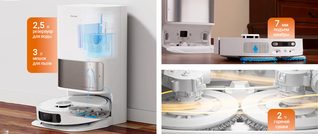 ИИ + 3D-навигация, Высота преодоления препятствий - 20 мм, Обслуживаемая площадь 200 м², 3 режима интенсивности подачи воды, Объем пылесборника базовой станции - 3 л, Объем резервуара для воды базовой станции - 2.5 л |