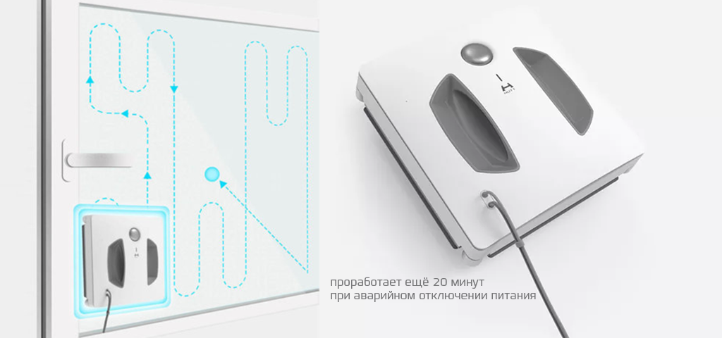 Xiaomi HUTT W55 один из самых быстрых роботов. Не забывайте менять тряпки. Тряпки можно стирать и использовать повторно. Работает от сети, но в случае отключения электричества он не упадет, а останется на поверхности работая от аккумулятора в течении 20 мин. В такой ситуации робот начнет подавать соответствующие сигналы и у Вас будет время, чтобы снять его. А на самый крайний случай у робота предусмотрен страховочный трос, который необходимо закрепить внутри помещения.