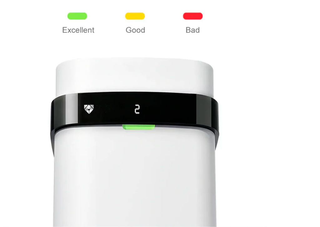 Очиститель выполнен в белоснежном цвете и оснащен светодиодным индикатором: если он излучает зеленый цвет, то качество воздуха отличное, желтое свечение означает среднее качество воздуха, а красное - низкое. Также изделие оборудовано LED-дисплеем, на котором отображается информация по текущим настройка