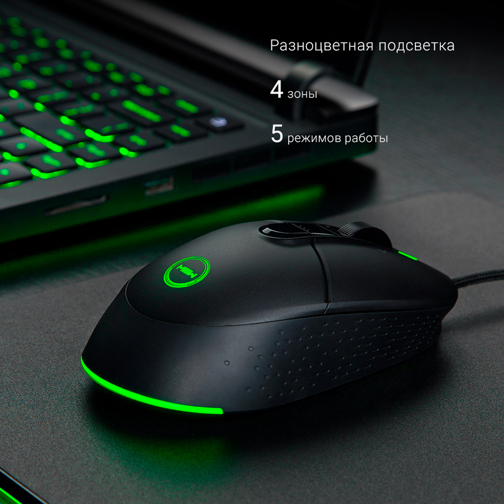 Многофункциональная мышь с корпусом из высокопрочного материала. Яркой особенностью модели является многоцветная подсветка. Эффект может функционировать в нескольких режимах – пульсирующем, дышащем, постоянном, последовательном и с быстрой сменой цветов