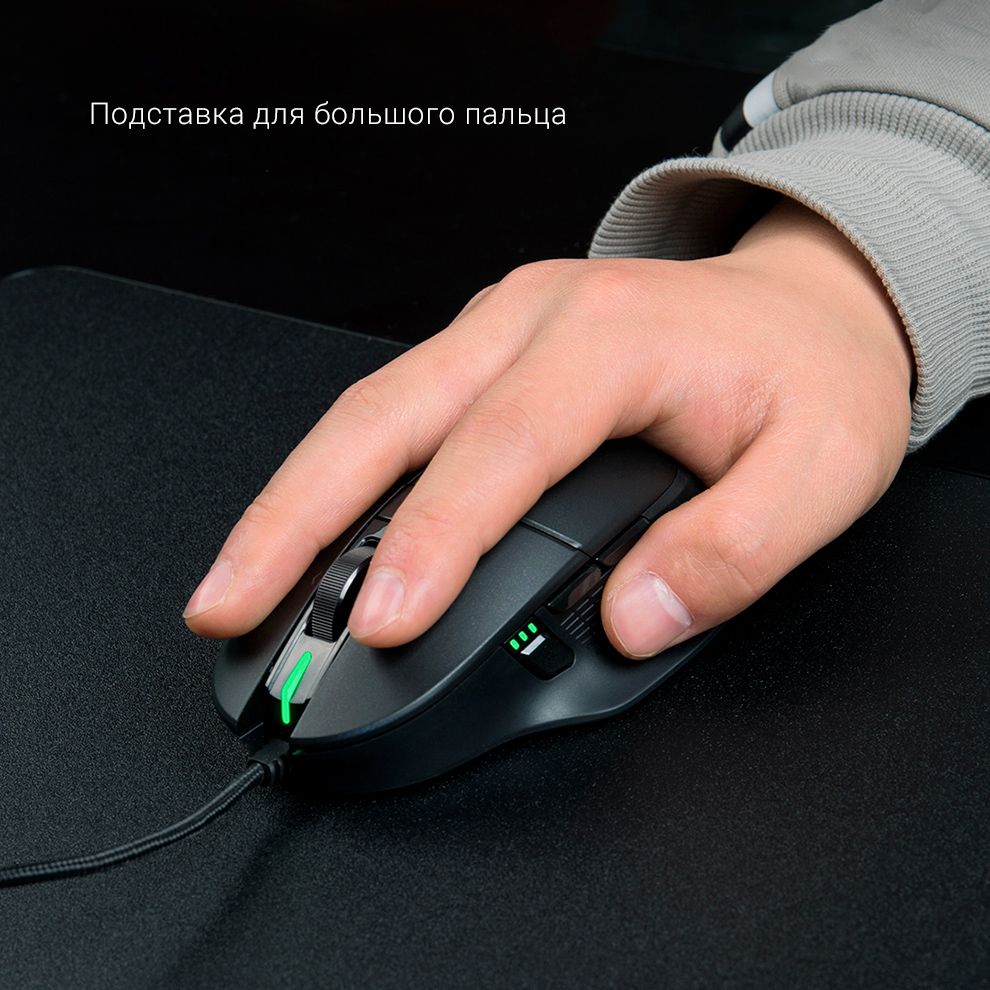 Удобство использования мыши MIIIW 700G 7200 DPI RGB USB 2.4 GHz повышает наличие специальной подставки для большого пальца. Благодаря такой форме корпуса прибора обеспечивается естественное положение руки и снижается усталость при долгой работе с компьютером.