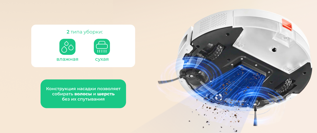 Одним из ключевых элементов являются две боковые щетки. Эти щетки вращаются в противоположных направлениях, что обеспечивает сбор мусора с обеих сторон пылесоса. Они тщательно собирают песок, шерсть домашних животных, крошки и пыль, позволяя устройству очищать даже труднодоступные места. Конструкция насадки устойчива к спутыванию волос, что особенно полезно для владельцев домашних животных. Благодаря этому, пылесос не требует частого обслуживания и ручной очистки щеток.